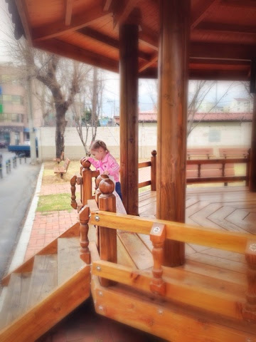 Today was so much fun. It started with Dan and I going to play racquetball together in the morning to get a little exercise. We haven't really played since college, so it was a lot of fun. And we are terrible. After that, we all went to lunch at our favorite place and got to introduce Diane to the bone soup. So so yummy. Then, after naps, we went to Apsan mountain and hiked for a while so we could see a Buddhist temple. That was seriously cool. I wish we spoke Korean or could read Hongul so we could know what the signs said at the temple, but just looking was pretty great as well. The details were just breathtaking. Also, it's cherry blossom season here in Korea, so the whole mountain was absolutely gorgeous. I tried to capture it a little bit with my camera, but I don't think I did it justice. Unfortunately, the tram wasn't working, so we didn't get to go up the rest of the mountain, but I think we all had fun. Everyone except for Emmett that is, cause he was a huge stinker.